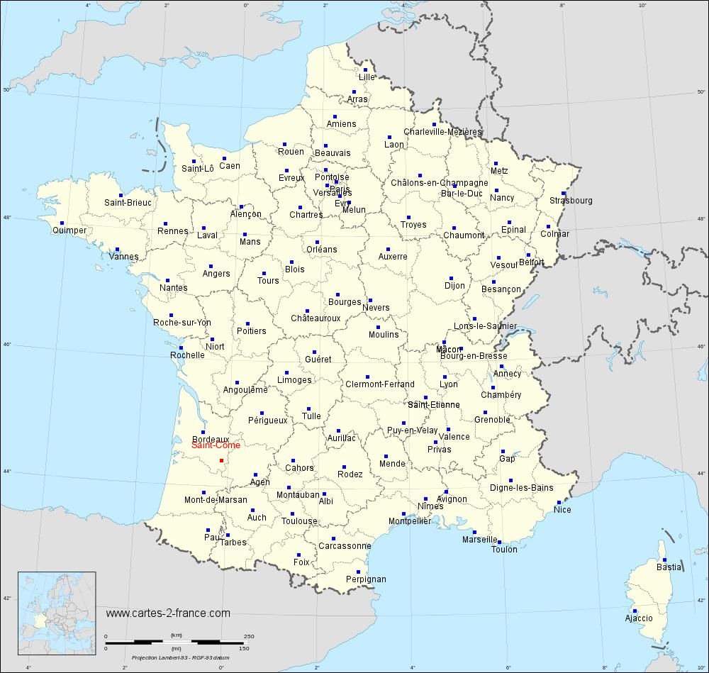 Carte de Saint-Côme : La carte dynamique de Saint-Côme ci-dessous permet de naviguer et de zoomer sur les alentours de la ville. La carte à gauche permet de situer Saint-Côme sur la carte de France et de déterminer sa position par rapport aux principales grandes villes françaises.